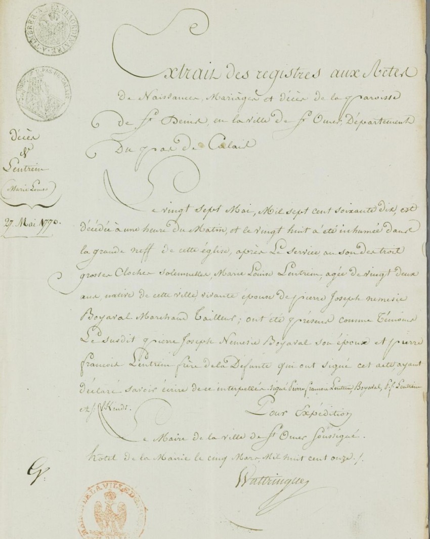 De 1ste echtgenote van Pierre Joseph Nemesie Boyaval: Marie Louise Lentrein, overlijdt op zondag 27 mei 1770, zeven dagen na de geboorte van haar 3e kind, te Saint-Omer op 22 jarige leeftijd. Haar overlijden wordt aangegeven door haar echtgenoot en door haar broer Pierre Francois Lentrein (bron: Saint-Omer Saint-Deniskerk, 418 acte 120 ; 11760-1785 pagina 604).
