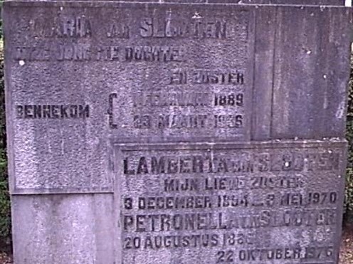 Na het overlijden van ds. H.A. van Slooten (Hendrik Adriaan, stamnummer: 6.5.4.6.3.) is, op basis van zijn uitdrukkelijke wens, notarieel vastgelegd dat de graven van diens grootvader meester van Slooten en zijn vader Ad/Adriaan van Slooten nu de Stichting Behoud Begraafplaats Bennekom als contactpersoon hebben. Beiden zijn Bennekommers met een grote cultuur-historische betekenis voor het dorp.
