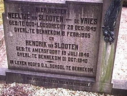 Hendrik van Slooten overlijdt op 31 oktober 1940 te Bennekom, 94 jaar oud. Zijn beroep was Hoofd ener school.