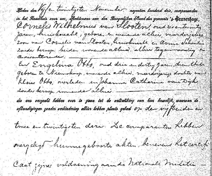 Cornelis Wilhelmus van Slooten huwt, 26 jaar oud en huisknecht, op 25 november 1903 te 's-Gravenhage met de 33 jarige dienstbode Engelina Otto. Haar beroep is later pensioenhoudster in de Theresiastraat 103A te 's-Gravenhage. Engelina Otto wordt geboren op 7 juli 1870 te Nieuwkoop en is een dochter van Klaas Otto en Johanna Catharina van Dijk.