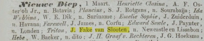 Op 7 maart en 17 maart 1860 verschijnt er in de Java Bode: nieuws, handels- en advertentieblad voor Nederlands-Indie onderstaande artikelen. Jacob Fake van Slooten is dan 1ste stuurman aan boord van de Ned.Indisch schip/schoener Fathal Hair. Het zou kunnen, gezien onderstaande artikelen, dat hij woont in Nederlands-Indie. Uit de gegevens van het Ministerie van Kolonien (Weeskamer Soerabaya) blijkt dat hij nog steeds gehuwd is, te Amsterdam, met J.J. Graalman en een dochter heeft. Bron: Ministerie van Kolonien, staat van nalatenschappen, afkomstig van particuliere personen welke onder het beheer van de Weeskamer te Batavia, Samarang en Soerabaya zijn gekomen en welke bij die Weeskamers door of namens de daarop "regt" hebbende, onder overlegging van de vereiste bewijzen van "erfregt" behoren te worden opgevorderd en ontvangen. Geen der erflaters heeft testament nagelaten, terwijl de namen de erfgenamen onbekend zijn.
