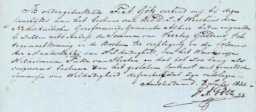 Wij verzoeken Willemijna (Willemijntje) te doen vestigen in de gewone koloniën. Haar oom F.A. (Ferdinand Albrecht) Götz zal aan het bestuur van de Nederduitsche Gereformeerde Gemeente van Amsterdam (net zolang als nodig is) 40 gulden betalen wegens tegemoetkoming in de kosten ter verpleging in de koloniën ter Maatschappij van Weldadigheid. Bron: Amsterdam, boedelpapieren van haar ouders Nicolaas Fake van Slooten en Hendrika Götz: brief van F.A. (Ferdinand Albrecht) Götz 8 juli 1841.