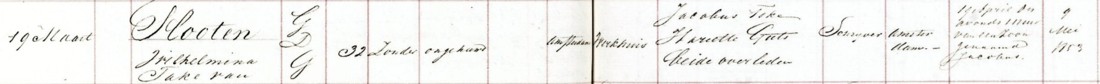 Op 11 januari 1859 wordt Willemijna (Willemijntje), 34 jaar oud en ongehuwd, in het Buitengasthuis opgenomen en overlijdt daar op 18 januari 1859. Haar woonadres was: Reguliersbreestraat H165, ring 7. Haar naam wordt geschreven als Wilhelmina van Slooten.